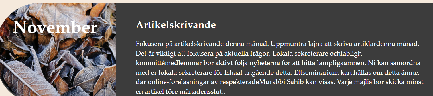 Om man på Kvinnoföreningens hemsida klickar på Tabligh, att sprida islam, står det att kvinnorna under november ska skriva artiklar: ”Fokusera på artikelskrivande denna månad. Uppmuntra lajna att skriva artiklar denna månad. Det är viktigt att fokusera på aktuella frågor. Lokala sekreterare och tabligh-kommittémedlemmar bör aktivt följa nyheterna för att hitta lämpliga ämnen. Ni kan samordna med er lokala sekreterare Ishaat angående detta. Ett seminarium kan hållas om detta ämne, där online-föreläsningar av respekterade Murabbi Sahib kan visas. Varje majlis bör skicka minst en artikel före månadens slut.”