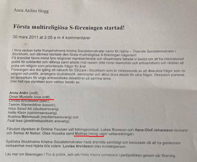 Här är ett axplock. År 2011 var islamisten Omar Mustafa med och startade föreningen Hjärta, troende socialdemokrater i Stockholm, tillsammans med Anna Ardin.