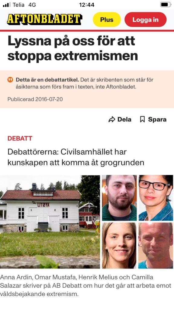 Året efter vill Anna Ardin och islamisten Omar Mustafa tillsammans med Henrik Melius, Spiritus Mundi, och Camilla Salazar, Fryshuset, i en debattartikel i Aftonbladet hjälpa till att stoppa extremismen, bland annat genom att: ”Vi måste alla erkänna och motverka den växande islamofobin i Europa och förstå hur den högerextrema ideologin fungerar som motor för våldsbejakande islamism.”