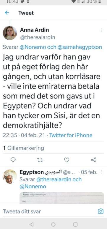Som om Ardin skulle vara en lämplig källa att fatta beslut utifrån. Hon påstår att Egyptsons engelska version, Holy White Lies, gavs ut ”på ett förlag med stöd av Emiratiska kulturdepartementet”. Här är ett inlägg hon gör på Twitter om den svenska utgåvan.