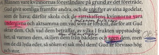 Inte heller mannens rätt att aga en uppstudsig hustru är någon nyhet för Sveriges del bara för att Expressen publicerar en artikel om en böneledare som tillämpar versen i en predikan. Här är koranversen 4:34, i K.V. Zetterstéens översättning 4:38: